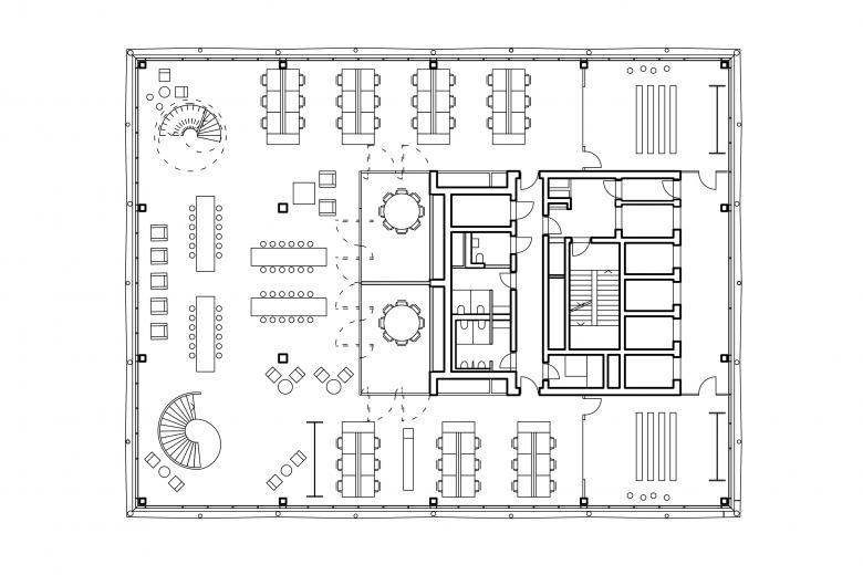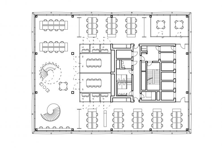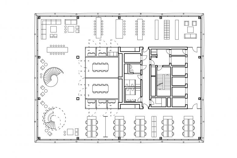 While stairs in the building’s base are straight, they curve to form ever-narrower spiral staircases in the tower above. These staircases provide access between the three-storey “neighbourhoods” stacked one atop the other, each of which contains a kitchenette, a break area, various informal meeting spaces, office workspaces, and conference rooms. The conference rooms are concentrated in the building’s open-plan centre, where they are organised around a stair core and wrapped in perforated wood sheathing. Large pivot doors create generous openings in the sheathing, blurring the threshold between the work and meeting spaces on either side.