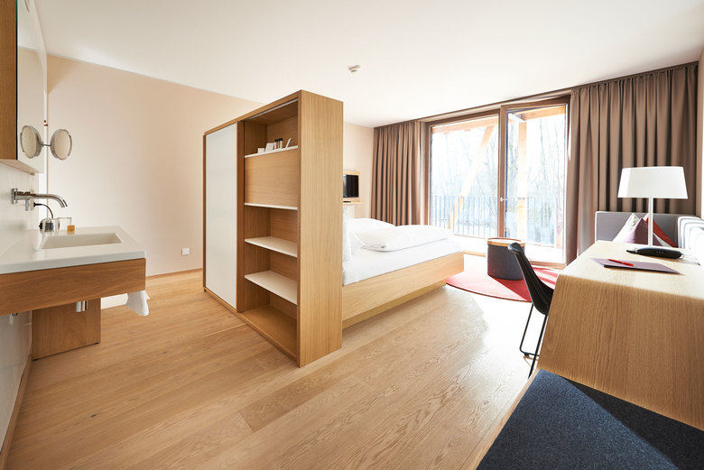 Der langgestreckte 5 geschossige Baukörper wird unmittelbar nördlich des bestehenden Bora Sauna Areals mit klarer Nord-Süd Längsachse positioniert. Die wichtige Ost-West Verbindung zwischen Auenwald und Herzenpark bleibt im EG mittels der grosszügigen Verglasung des Foyer-, Rezeptions-, Bar- und Loungebereichs und deren funktionaler Aussenbezüge trotz Überbauung erhalten. Der umgebende Landschaftsraum wird dann über eine durchgestecktes transparentes Haupttreppenhaus bis in das Dachgeschoss hinein erlebbar gemacht. Ein- und Ausblicke zu Bodensee und umgebenden Naturraum werden so als ständige Begleiter des Gastes bei der Durchwegung des Hotels aktiviert. Ein raumgreifendes Vordach definiert einen grosszügigen Hotelvorplatz. Dieser Platz vermittelt zwischen dem öffentlichen Strassenraum und dem privateren Hotelfoyer, empfängt und entschleunigt den ankommenden Besucher.