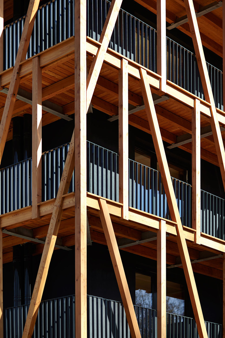 Die Fassade des Gebäudes ist durch einen dreischichtigen Aufbau charakterisiert:Aussenhaut: vertikale Holzfachwerkkonstruktion als gestaltbildende Hüllstruktur vom 1.- 3. ObergeschossTrägerroste: statisch wirksame, geschossweise umlaufende Holzroste als Zimmer und/oder Fluchtbalkone