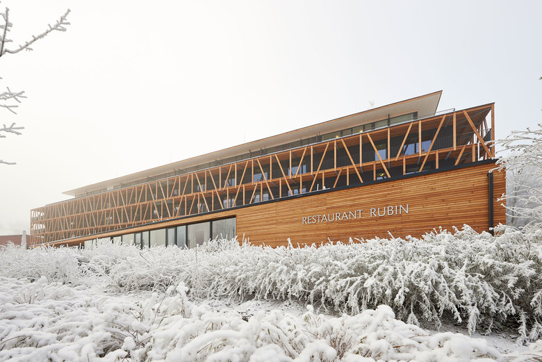 Die Gestaltung der Aussenhaut orientiert sich an den traditionellen Fachwerkbauten der Region. Das Bundwerk aus natürlichem Werkstoff Holz vermittelt optisch zwischen Bauvolumen,Landschaftsraum und zwischen Innen und Aussenraum. Durch ihre optische Leichtigkeit verleiht die vorgesetzte Holz-struktur dem voluminösen Bauvolumen eine kompaktere, dynamischere Erscheinung mit handwerklichem und ornamentalem Charaker. Die traditionsnahe Struktur garantiert ein schnelles Wiedererkennen und bekommt somit Symbolcharakter für ästhetische und technische Dauerhaftigkeit zum Erhalt eines Naturparadieses.