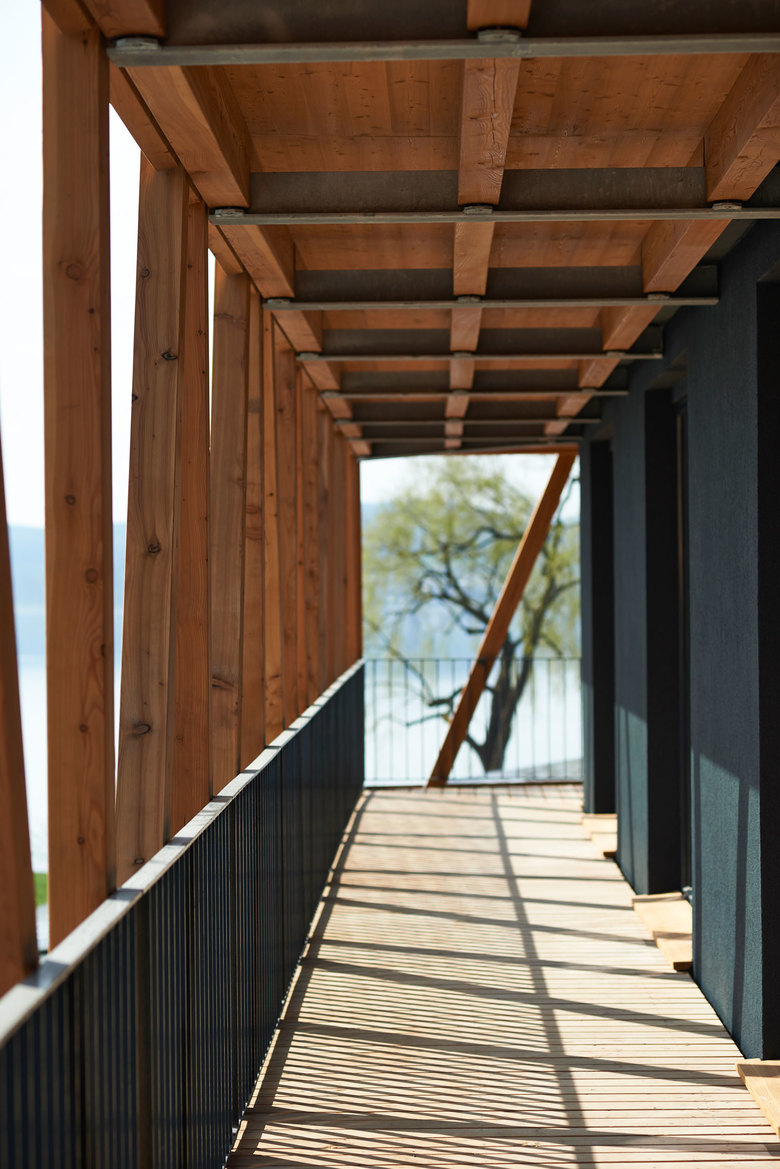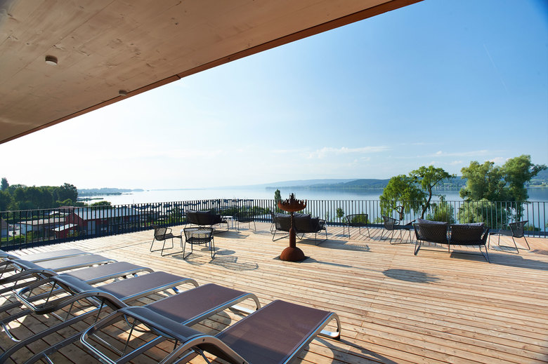 Die Nord-Süd-Achse auf der erhöhten Ebene der Obergeschosse und Sky-Bar unterstreicht hingegen die Verbindung zum Seeufer und ermöglicht von den Zimmern und Erschließungsfluren eine privilegierte Sicht auf den See. Die süd/westlich dem Hotel vorgelagerte Japansauna stellt eine funktionale Erweiterung des Bora Saunaareals dar und fungiert zugleich als wichtiges Bindeglied zwischen dem Hotel und HotSpa Bereich. Die Japansasuna verhindert durch ihre Anordnung jedoch auch störende Blickbeziehungen zwischen den Hotelzimmern und dem bestehenden Bora-Sauna-FKK-Gelände.