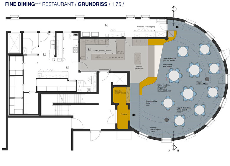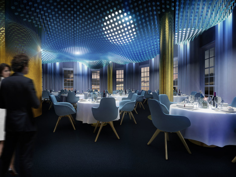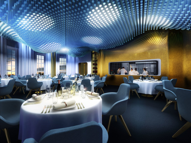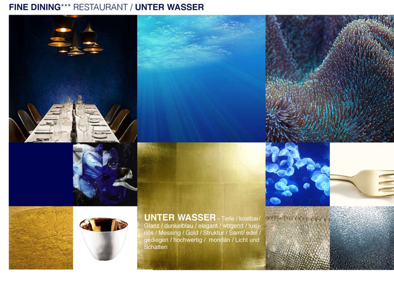 Fine Dining Seafood-Restaurant, gestaltet als Unterwasserrestaurant mit gewellter Lichtdecke aus Acrylstäben zur Simulation von Lichtreflexen im Meer.
