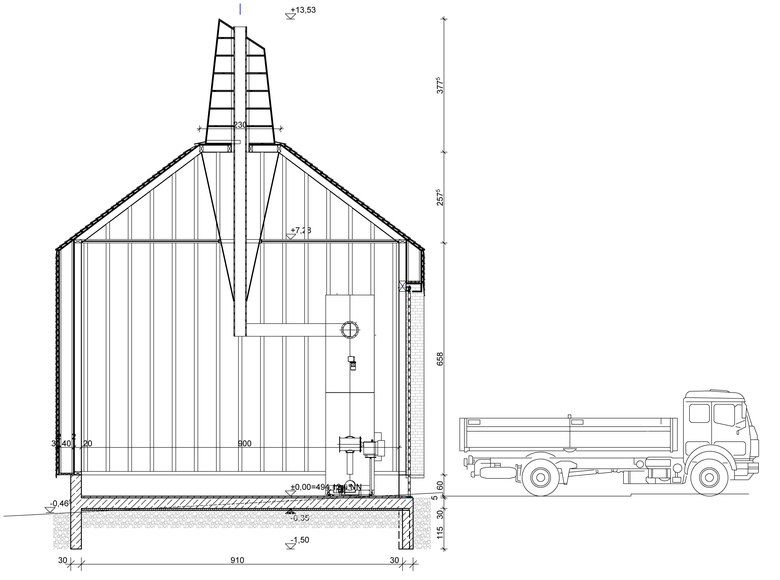 Planung und Umsetzung eines Biomasse-Heizhauses in Bad Aibling in Zusammenarbeit mit dem Studio Matteo Thun, Mailand (I). Umfang: ca. 100 qm