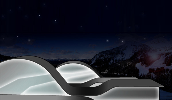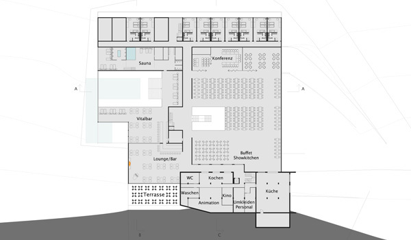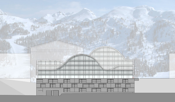 Wettbewerbsentwurf, 2.Preis, für ein privates Ferienhotel am Nassfeld. Die gebauten, begehbaren “Schneewehen” lassen das Hotel als Landart erscheinen und wirken der weiteren Zersiedelung des Skigebietes entgegen. Umfang: ca.60 Zimmer, Spa-Bereich, Restaurant,Bar