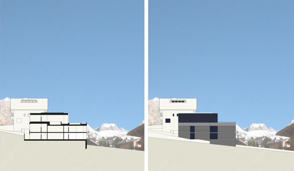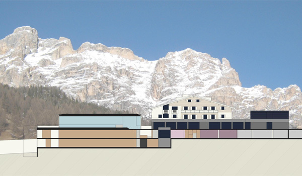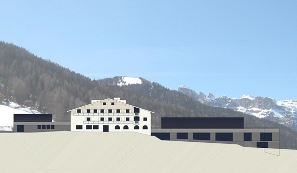 Wettbewerbsentwurf, 2.Preis, für ein privates Ferienhotel im Grödner Tal. Umfang: ca.30 Zimmer, Spa-Bereich, Restaurant, Bar