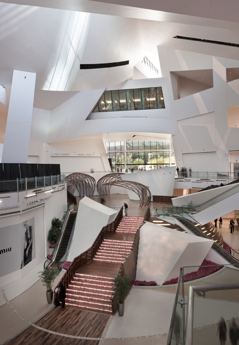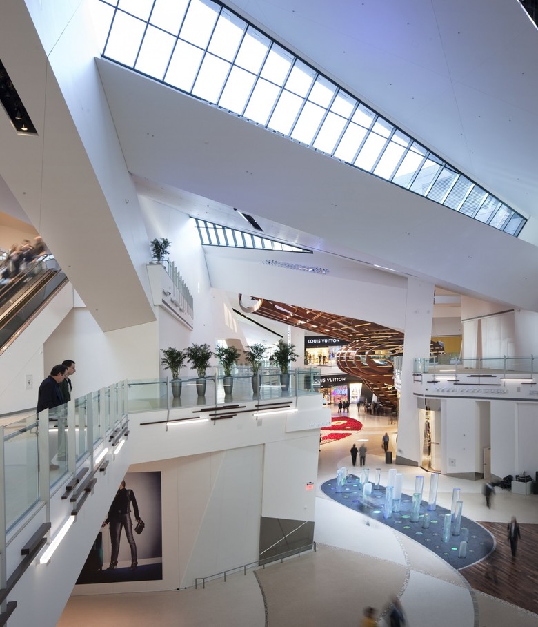 “Jagged, crystalline shapes are characteristic of Libeskind… here they inject the normally dreary precinct of a shopping mall with a shot of adrenaline; they also provide some unexpectedly grand spaces, which accommodate interiors designed by David Rockwell.”—Paul Goldberger, New Yorker (October 2010)
