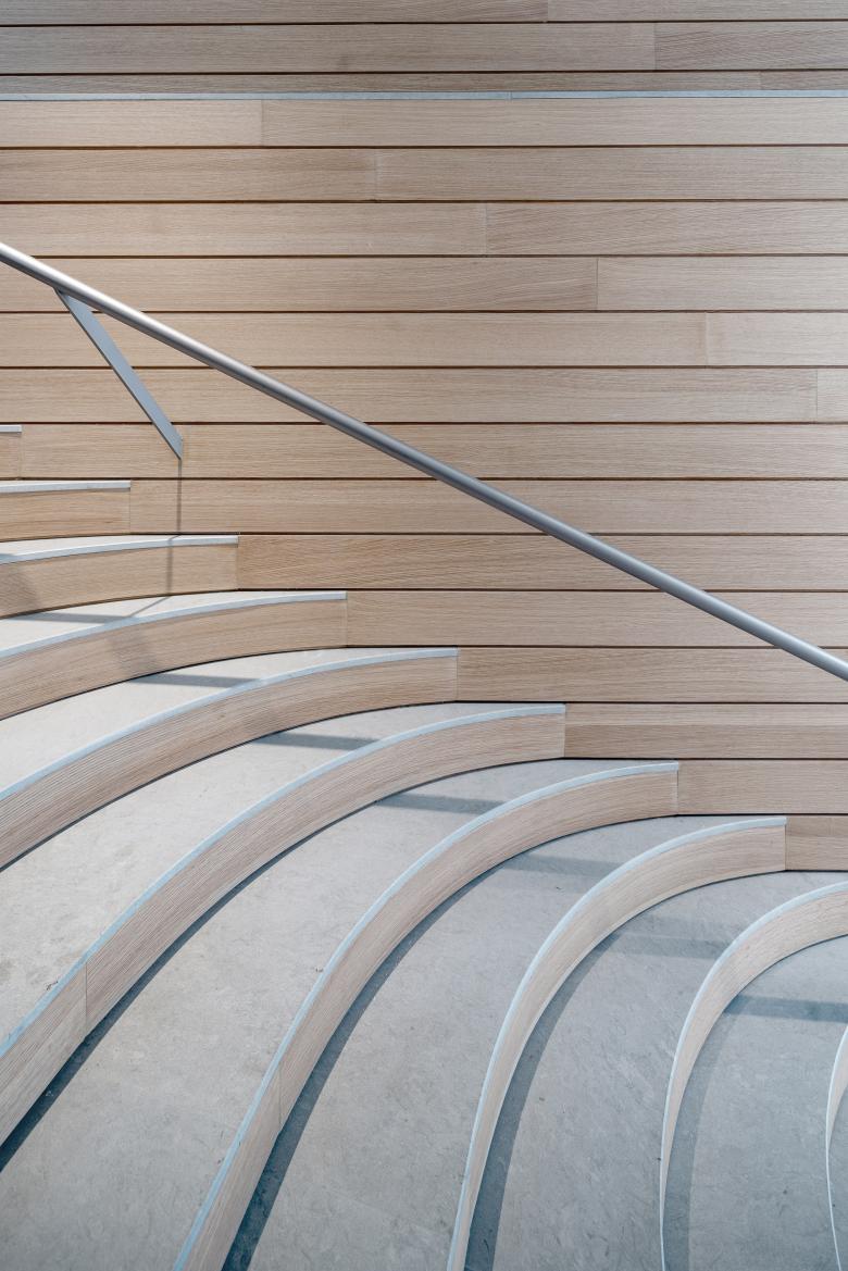 The exterior skin of the building is clad with parametrically designed stainless steel panels, while the interior surfaces are defined by a palette of wood and metal that extends the material strategy of the exterior form. The metallic form of the project promotes a sense of technology and optimism in line with the aspirations of the surrounding urban neighborhoods.