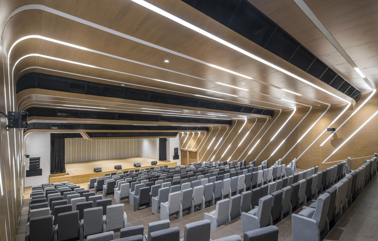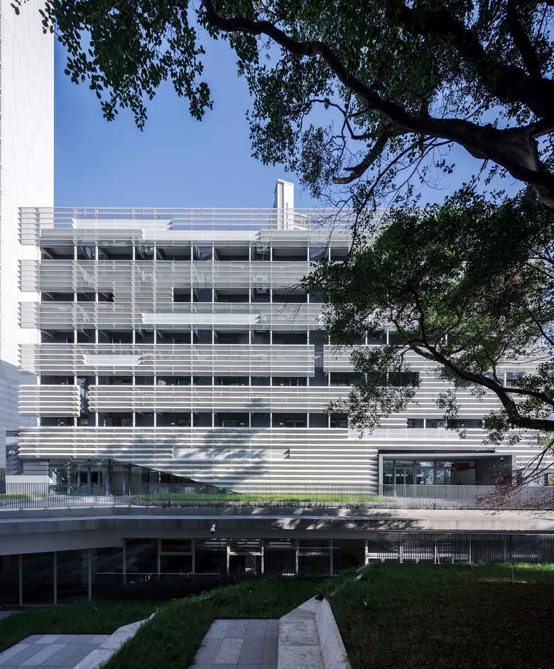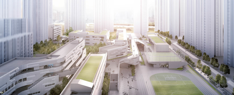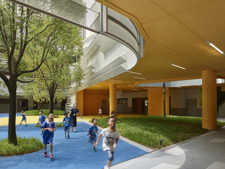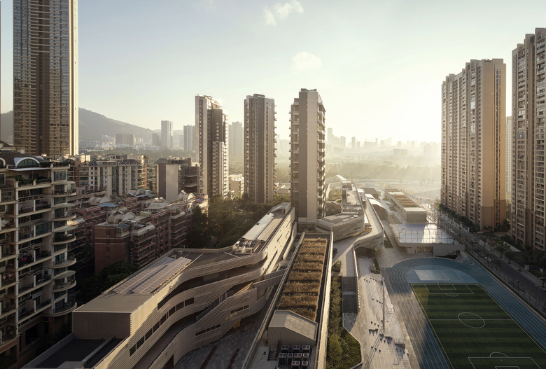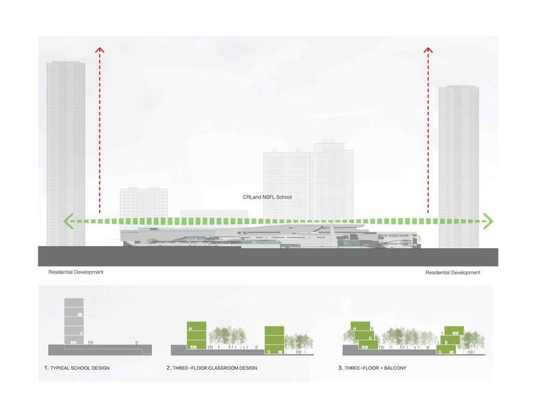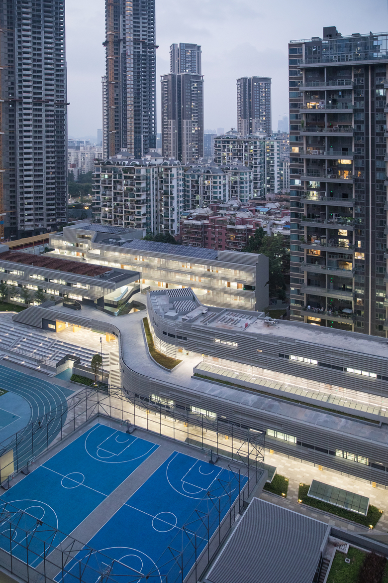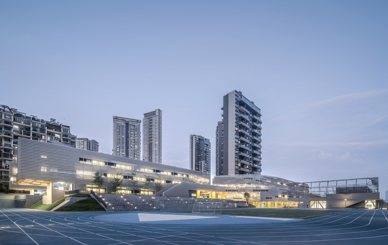 CRLand NSFL is a 54,000 m² elementary and middle school campus, comprising regular and specialized classrooms, library, gymnasium, indoor swimming pool, auditorium, dormitory, along with dining halls, and dedicated playgrounds. Located in Shenzhen’s newly developed DaChong neighborhood, the campus is conceived as a sweeping, horizontal garden that stands in sharp contrast with the ever denser, ever more vertical urban environment it serves.