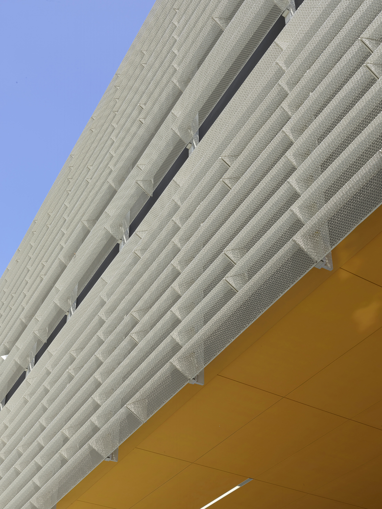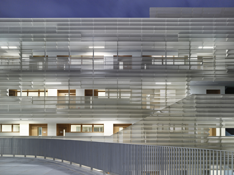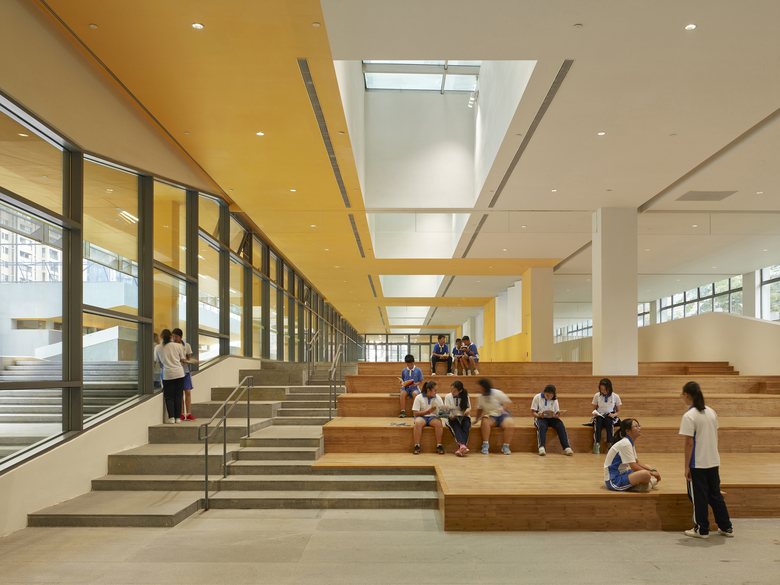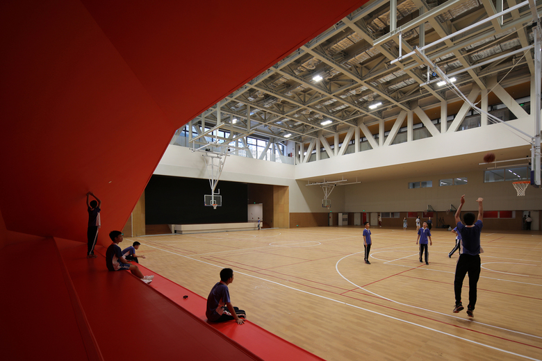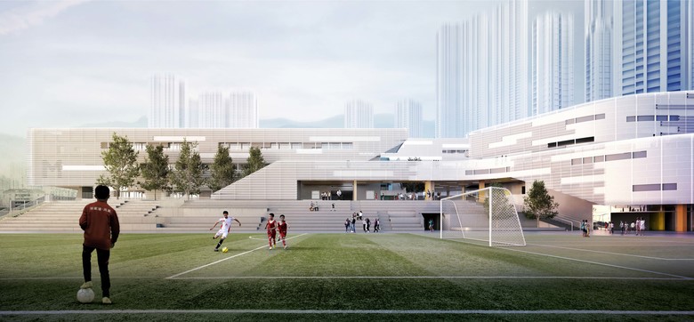 To achieve this low-rise condition, Studio Link-Arc’s design uses the natural slope of the site to top the large program volumes of the gym, pool, dining halls and auditorium with a series of terraced platforms, which become a new ground for dedicated teaching spaces and playgrounds. This configuration allows an unrestrained linear organization of all teaching spaces without the need to develop the building vertically. The design uses a three-story bar arrangement of staggered classrooms that sweep the site from east to west, chasing every available square inch of sunlight penetrating the surrounding concrete forest. In return, the sinuous motion of classroom ribbons generates a fluid sequence of outdoor spaces tailored to the specific needs of each teaching area. The dynamic, elongated courtyards of the specialized and middle schools turn into enclosed, protective courtyards for the primary school and library, or conversely, open into vast grounds used for physical activities.