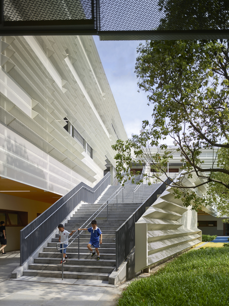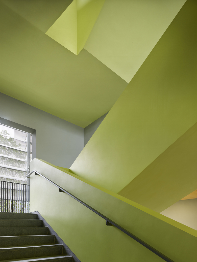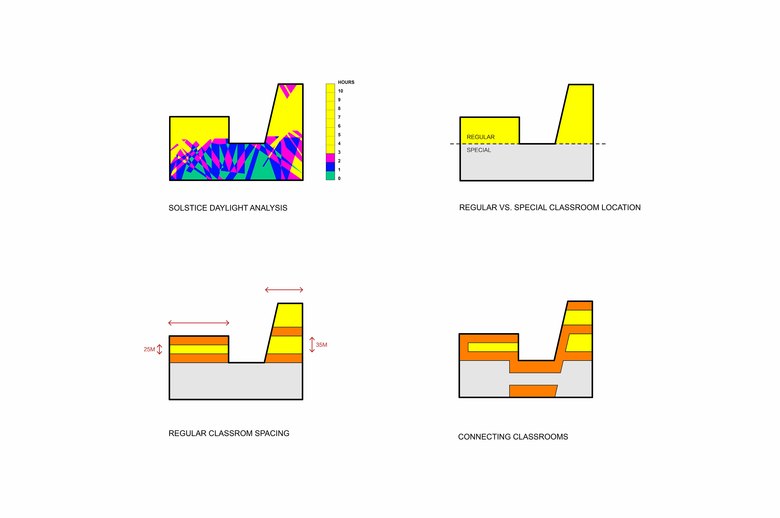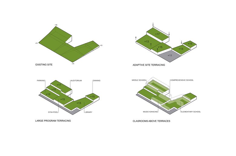 The project intentionally breaks with conventional school design - which divides the campus into buildings and functional zones - in favor of a sectional organization of spaces that maximizes access to green space and daylight for each classroom independent of their location. This strategy imposes a perpetual tweaking of the vertical arrangement of spaces, which generates endless sectional variations and creates a highly diverse compendium of spatial conditions for play, recreation, and interaction.