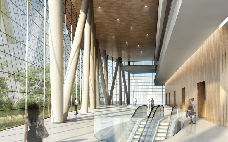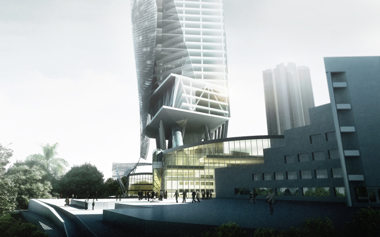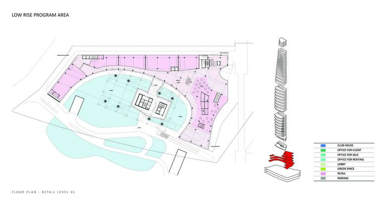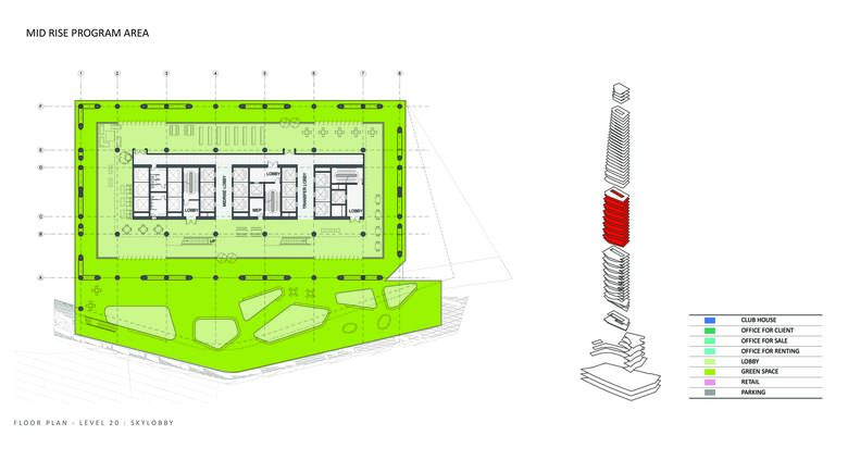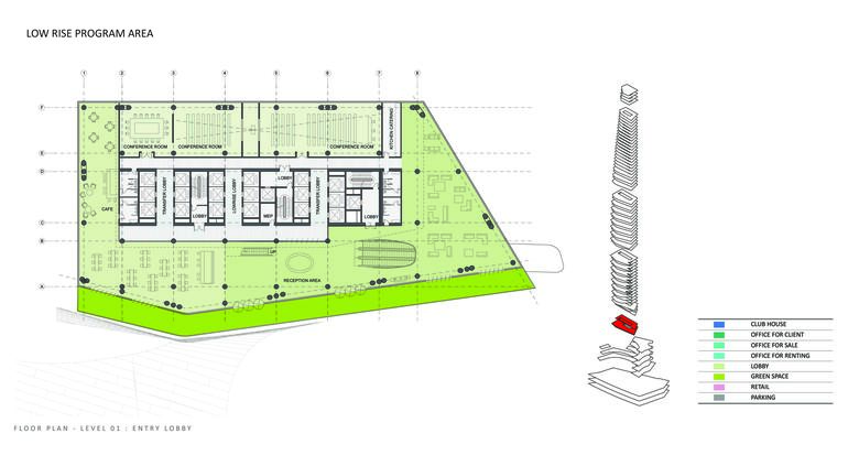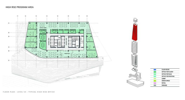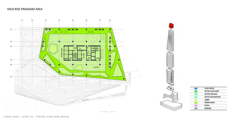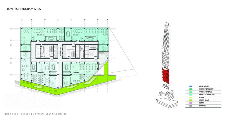 The depth of the floor plate reduces as the floors rise, allowing natural light to penetrate deeply into the office spaces while allowing for stunning panoramic views. A shaded southern façade improves energy efficiency and increases user comfort by reducing solar heat gain. The top of the building includes a clubhouse, with an interior garden that enjoys panoramic views of the city. A restaurant and lounge on the lower levels of the clubhouse is designed to maximize these views.