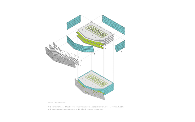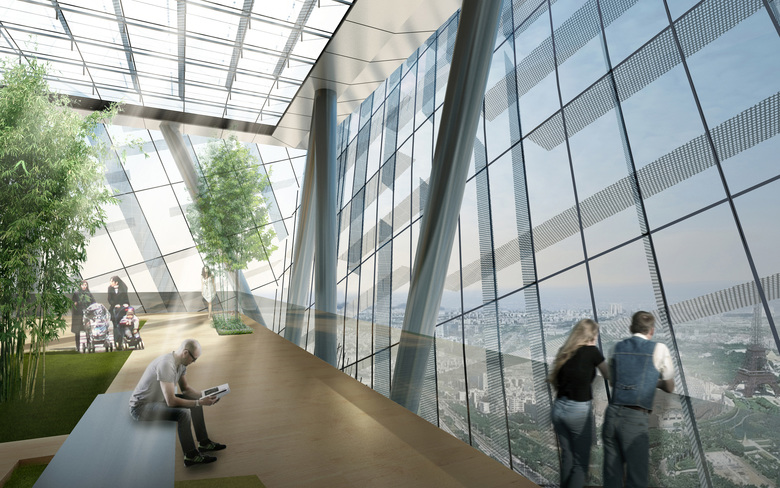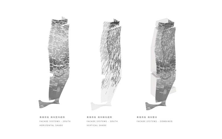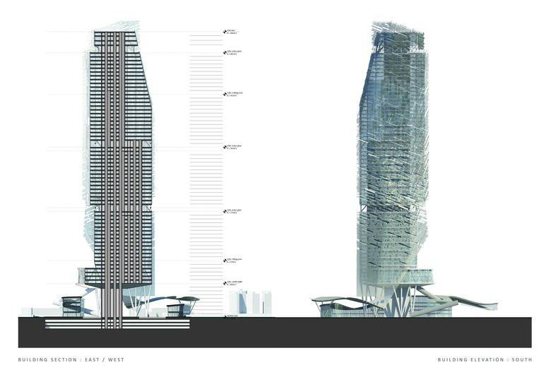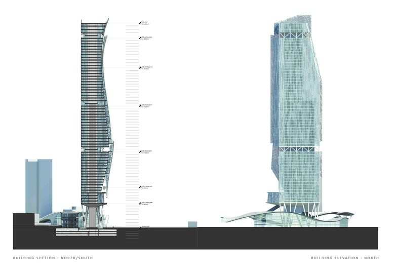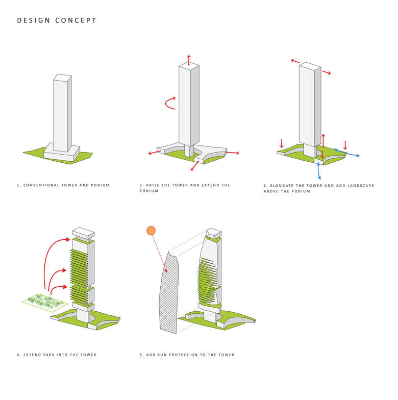 The addition of gardens on the south façade allows the park to extend from the ground level into the tower, adding amenities for the office workers. These outdoor gardens create cooler shaded spaces in the summer and passively warmed zones in the winter, enhancing user comfort and enhancing the building’s environmental response. In addition, the office tower is punctuated by a series of sky lobbies, creating extensive outdoor areas that allow workers to take breaks and conduct informal meetings.