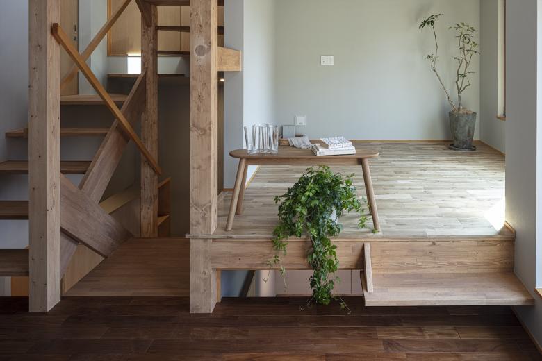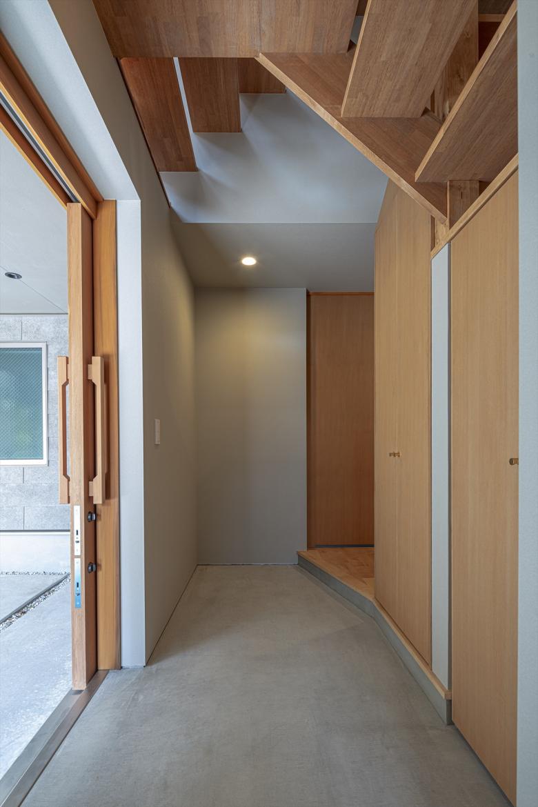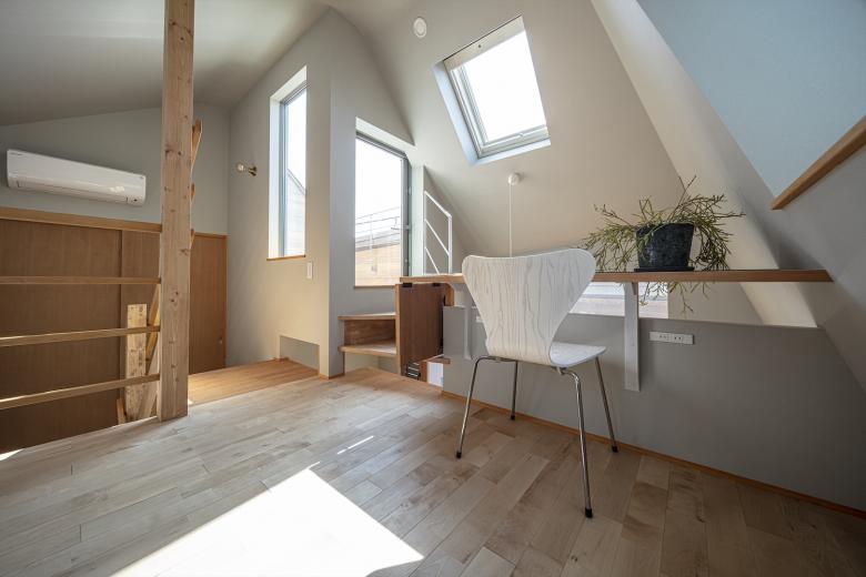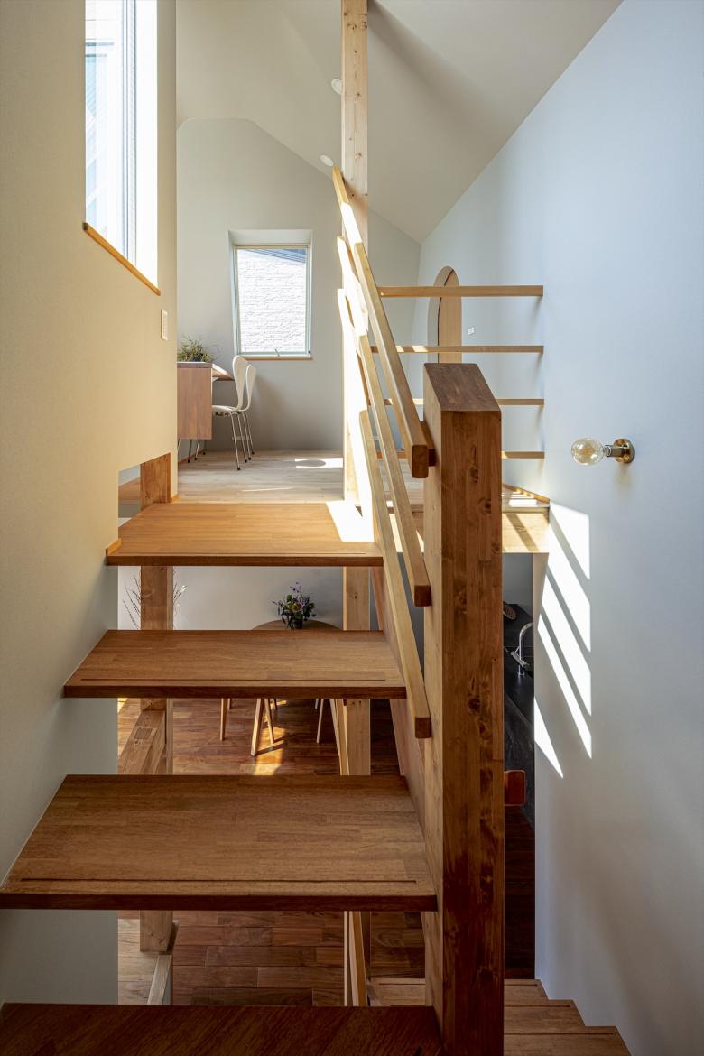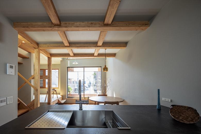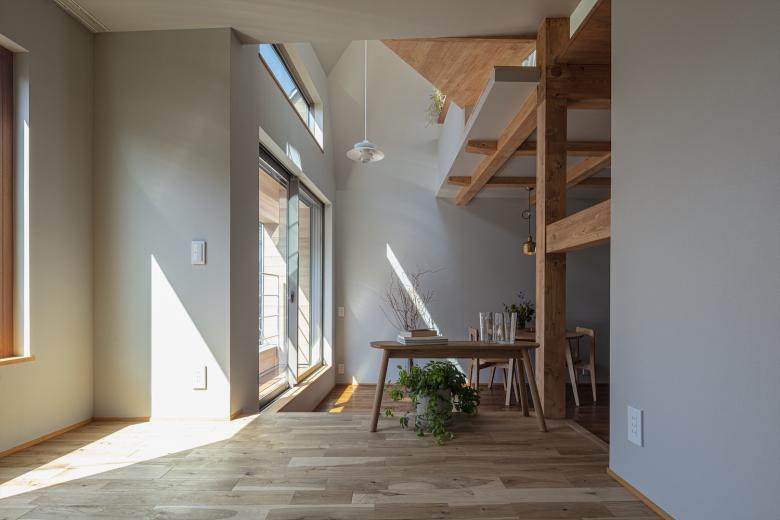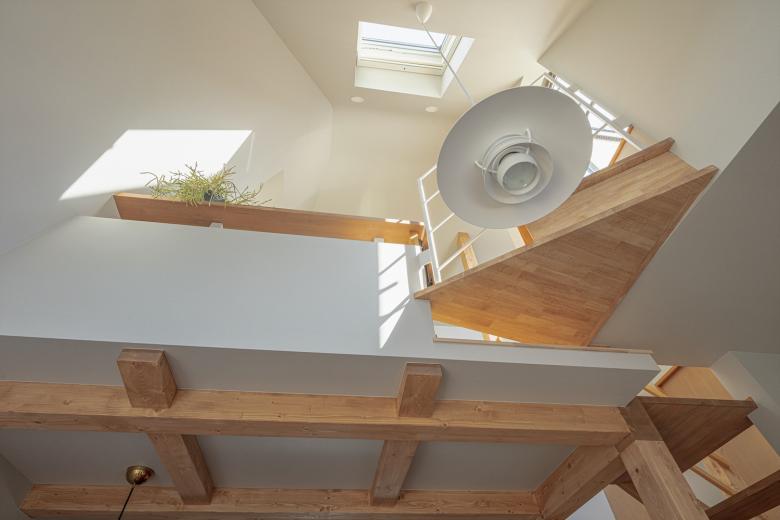 敷地に目一杯のボリュームを立ち上げた上で内部空間を立体的に構成することにより、適度に視線が抜け、光や風を通し、明るく変化のある場を生み出している。