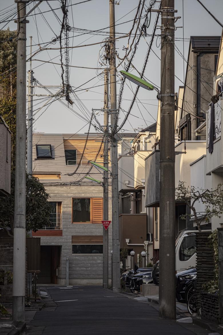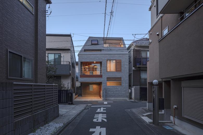 住宅密集地のなか、T字路に面して建つ仕事場付き住宅。