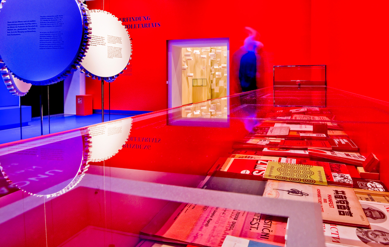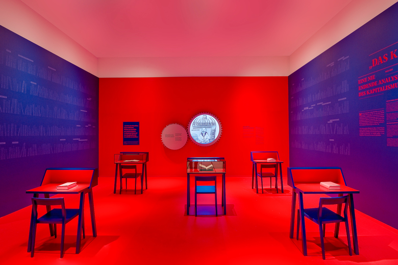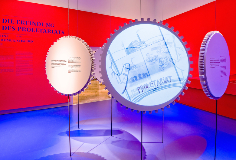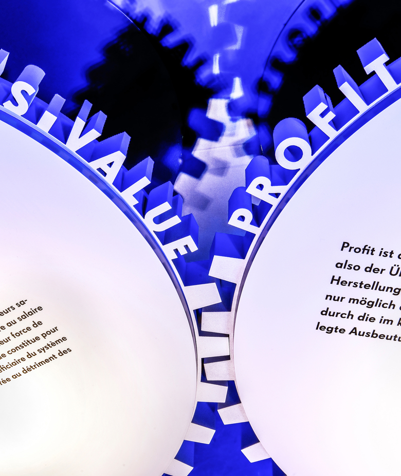 Die Landesausstellung im Rheinischen Landesmuseum Trier nimmt anlässlich des 200. Geburtstages von Karl Marx sein gegenwärtig wieder hochaktuelles Lebenswerk in den Blick. Der gestalterischen Idee folgend, entwickelt sich das Zahnrad von dreidimensionalen Begriffszahnrädern bzw. Gedankenzahnrädern innerhalb der Ausstellung zu einer komplexen Gedanken- bzw. Marx-Maschine. Die anspruchsvollen theoretischen Inhalte werden in drei Denkräumen, die seine drei Hauptwerke vertiefen, neben klassischen Begriffserklärungen per Text zusätzlich bildlich über Projektionen mit erläuternden Comics auf den Zahnrädern vermittelt.