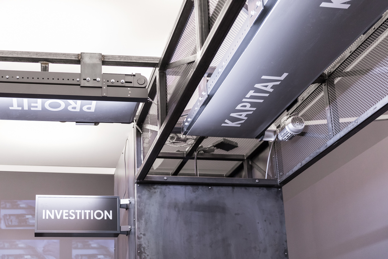 Der konzeptionellen Idee der Denkräume folgend, werden die Überlegungen von Marx in Form einer Maschine dargestellt, die auf Grund ihrer Komplexität und Größe das gesamte Raumbild prägt. Förderbänder transportieren Marx´ Ausführungen zur kapitalistischen Produktion durch den gesamten Raum und bilden in abstrahierter Form zugleich deren Zusammenhänge ab.
