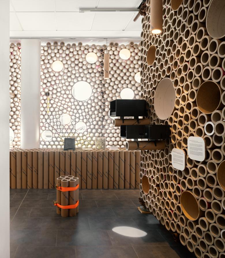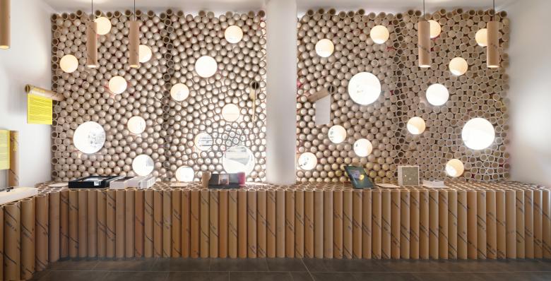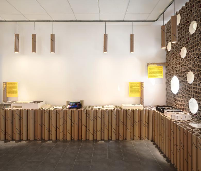 Statt neu produzierte Materialien zu verwenden, greift die Ausstellung bewusst auf bestehende Ressourcen zurück. Pappröhren aus einer lokalen Druckerei, die sonst Abfall wären, bilden die tragende Struktur der Inszenierung. Nach der Laufzeit erhalten sie eine neue Nutzung, etwa im Möbelbau, in Schaufenstern oder Kindergärten. Die Vision, Materialien nicht zu entsorgen, sondern weiterzudenken, wurde konsequent realisiert – nichts blieb übrig, alles fand eine neue Form.