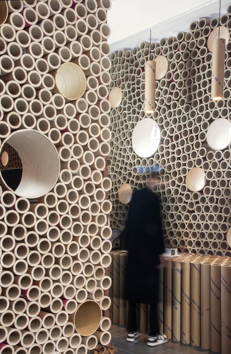 Die angewandte Strategie hinterfragt konventionelle Produktionsprozesse und zeigt, wie Recycling in der räumlichen Gestaltung eine überzeugende gestalterische Qualität entfalten kann. Zugleich versteht sich das Projekt als Prototyp für zukunftsweisende Zero-Waste-Konzepte.