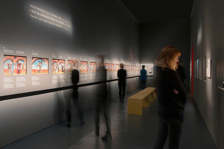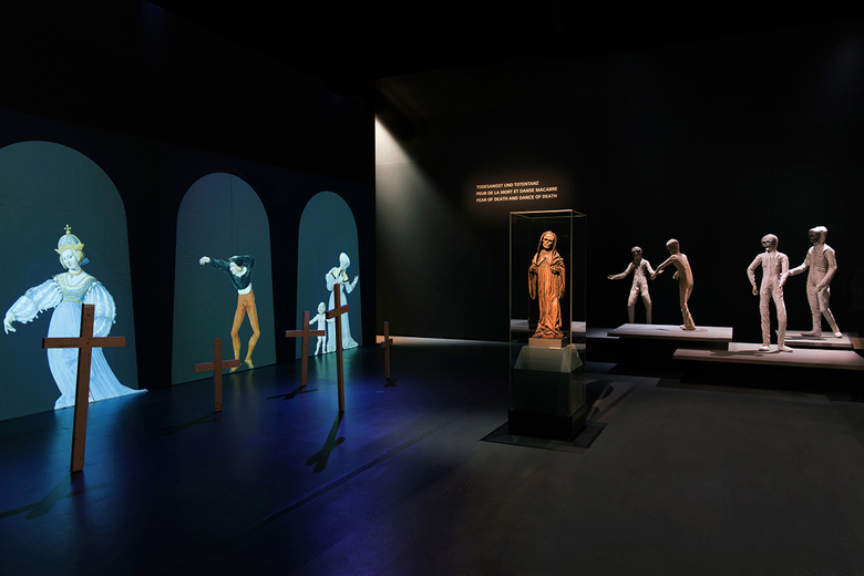 Geld und Politik thematisiert, welche gerade in heutiger Zeit wieder überraschend aktuell sind. Über einen Friedhof, vorbei an bewegten, lebensgroßen Totentanzdarstellungen gelangen die Besucher - die Allgegenwärtigkeit des Todes spürend - in das Zentrum der Ausstellung.