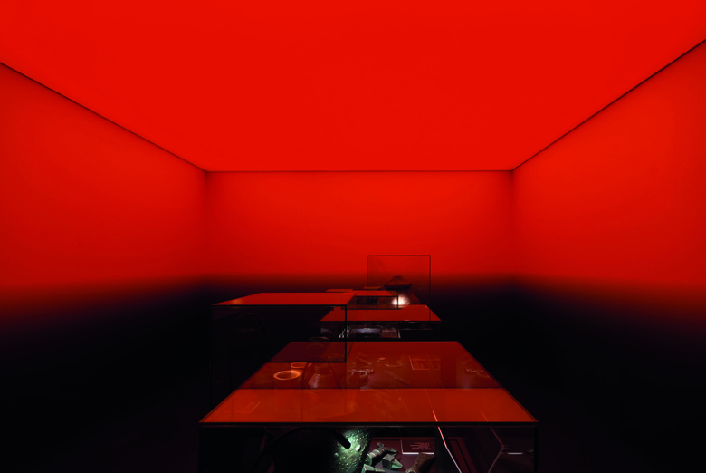 So wird die Entwicklungsgeschichte der rheinland-pfäl- zischen Region anhand von 13 sehr unterschiedlichen Kuben plastisch erzählt. Die Besucher tauchen auf ihrem Rundgang erst ins Urmeer ein, gelangen dann über ein Labor, in dem die Funde der Erdgeschichte analysiert werden, in den Kubus der Bronzezeit. Zu dieser Zeit entdeckten die Menschen die Metallbearbeitung durch Feuer. Dieses Element wird mit einer orangefarbenen, glühenden Decke umgesetzt, die den abstrakten Raum in ein warmes, rötliches Licht taucht.