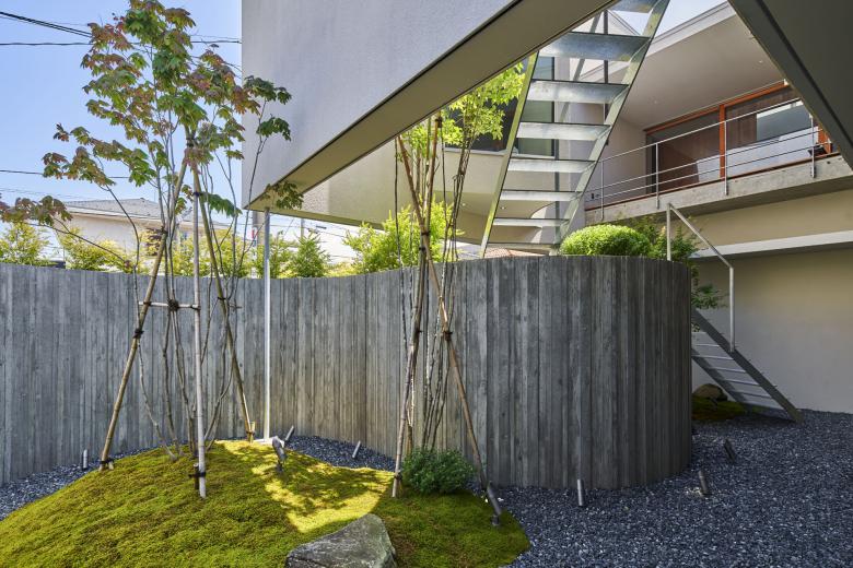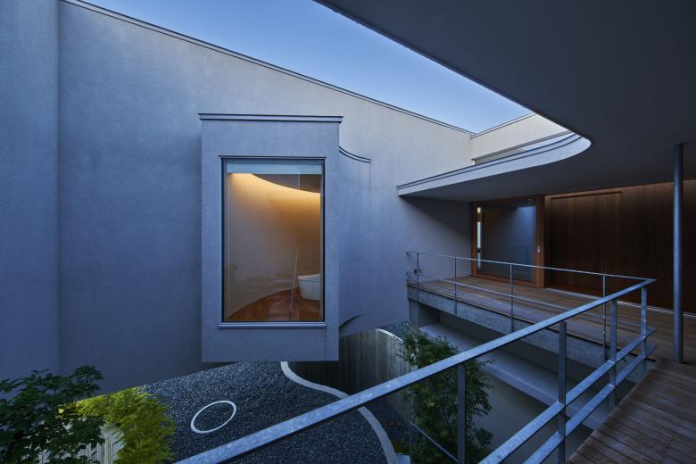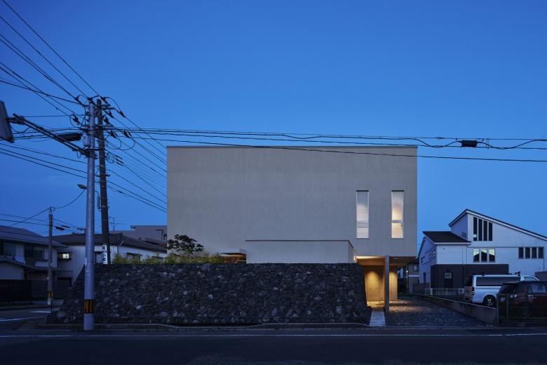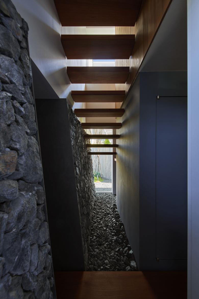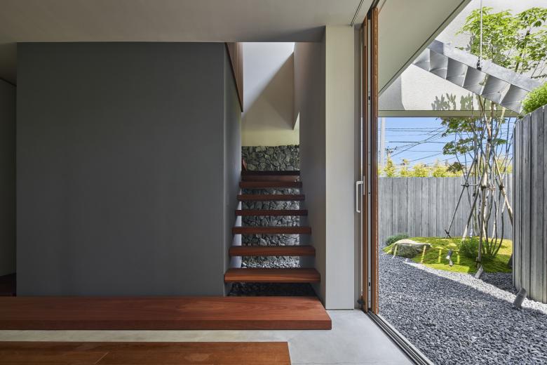 敷地は住宅のほか、神社、学校など様々な要素に囲まれている。周囲を行き交う人の視線や喧噪から距離を置く環境を作るとともに、大地や空を眺め、近づくことができる家を計画した。