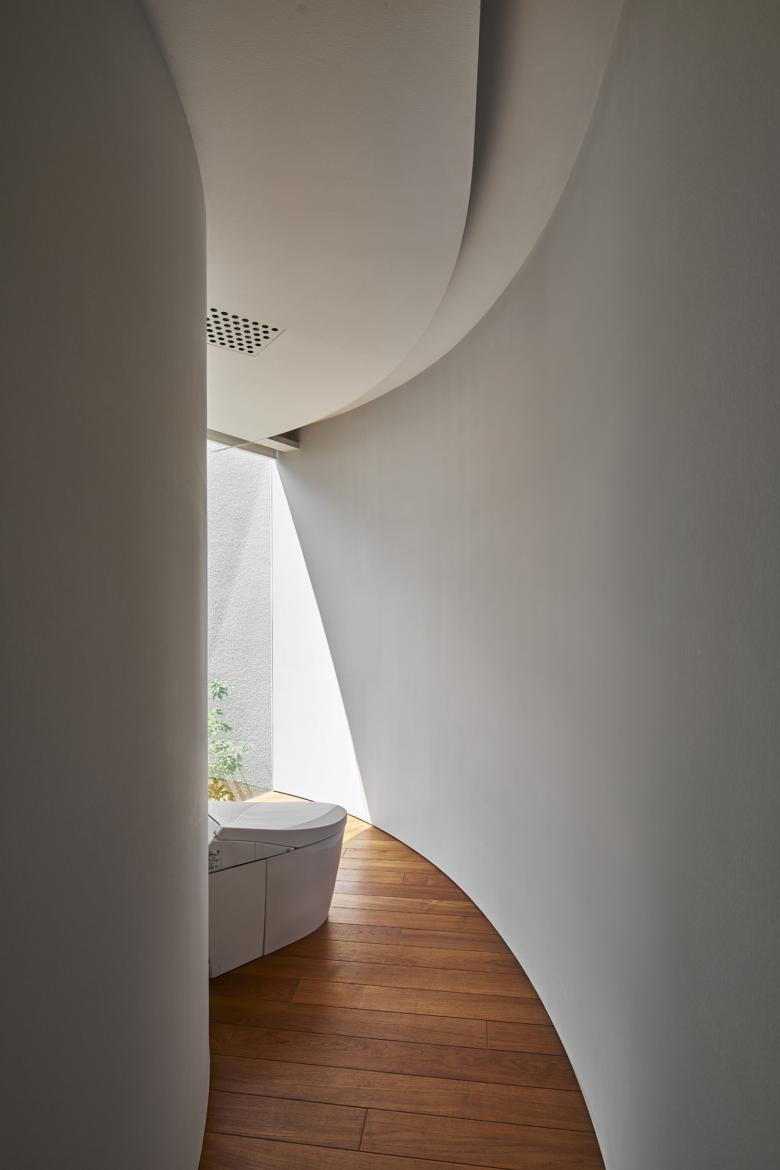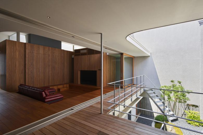 擁壁をインテリアとして取り込み、まるで地中にいるような感覚になる1階。浮き壁と堀り込まれた1階を眺めると、まるで浮遊してるような2階は空をより近くに感じられる。