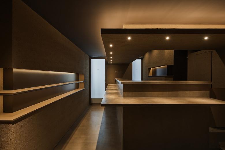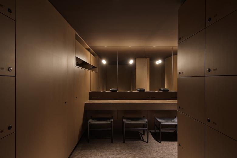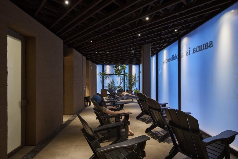 大サウナ室は、一般的な都市型サウナにありがちな閉塞感を取り払い、大きな開口からは坪庭の緑を眺め、その向こうに町の光が柔らかく透けるように配置。