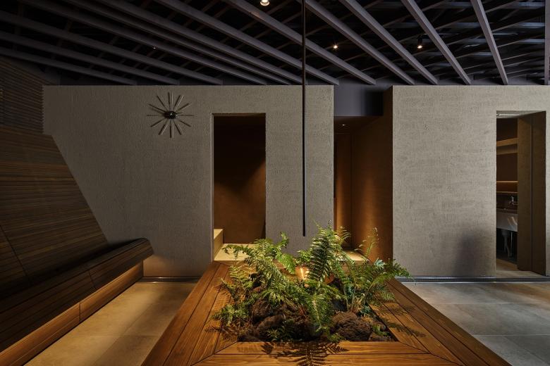 壁には土の左官仕上げを施し、柔らかで温かみのある質感が包まれるような安心感を生み出します。木材は、サウナ特有の熱や湿度に適応しつつ、触れたときのぬくもりや心地よい香りを大切に。館内の随所に配された緑が、自然のやすらぎをもたらし、都市にいながらも、どこか屋外にいるような感覚を生み出します。