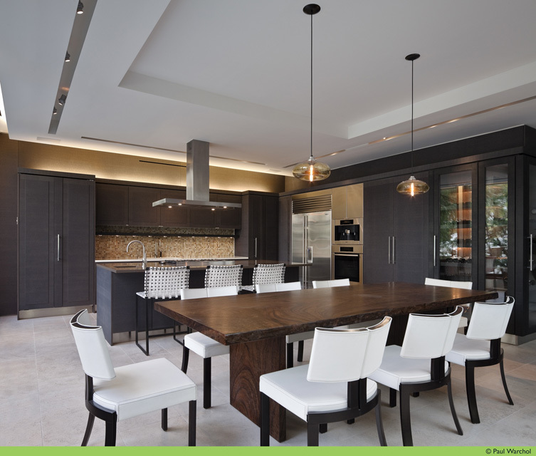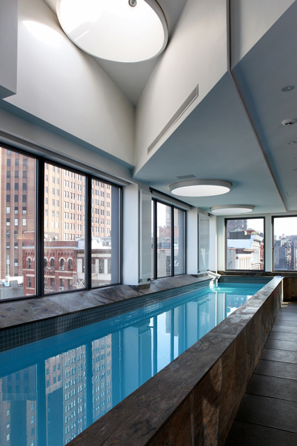The home features a two-car loading dock, a 50-foot indoor lap pool, indoor gym, library, screening room and offices for both owners in addition to 6 bedrooms and 11 baths. On the second floor a kitchen, dining room, living room and poolroom overlook a sunken landscaped courtyard with steps up to the larger main garden on the third floor.