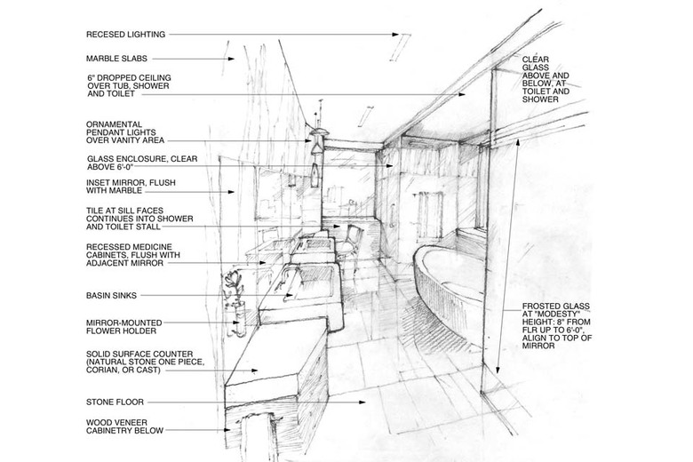 To maintain the clean, unbroken lines, heightened attention to finish included camouflaged electrical outlets and concealed sound systems, detailed indirect lighting, and self-closing pocket doors. State-of-the-art audio-visual systems are concealed behind nearly invisible doors.