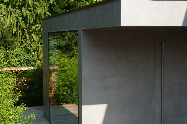 Um- und Anbau eines Einfamilienhauses in München-Trudering. Minimaoistische Details - bündige rahmenlose Verglasung - bündiges Fügen der Materialien - monolithische Oberflächen.