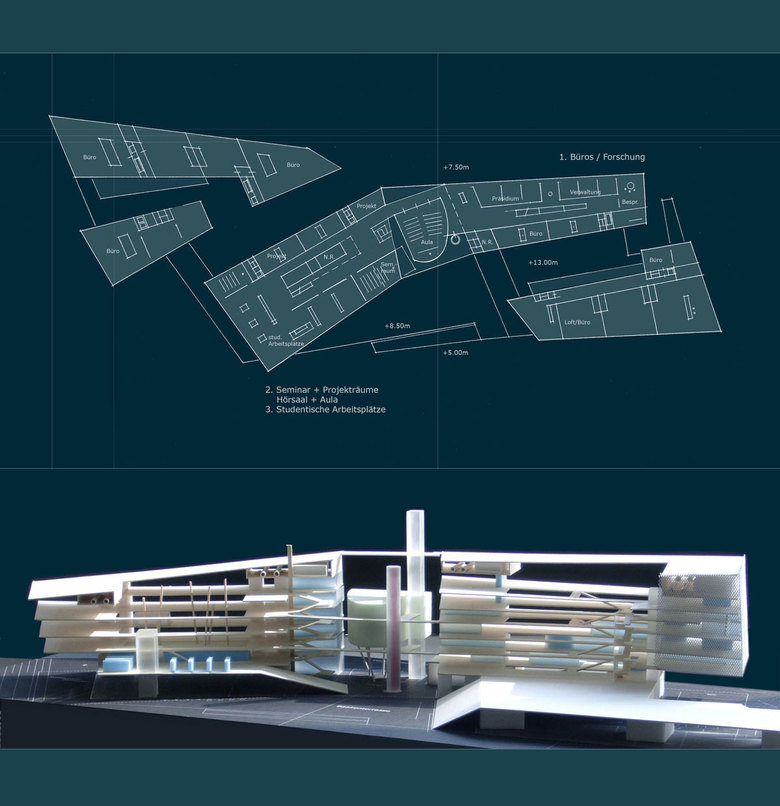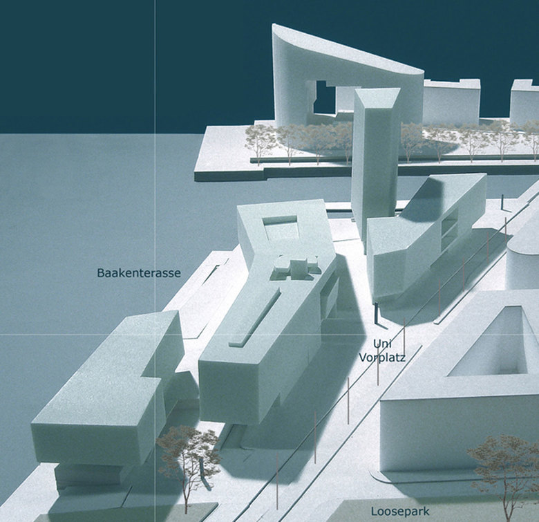 Raumbestimmendes Element ist zum einen das langgestreckte Gebäude der Hafenuniversität, zum anderen ein 70 m hoher Hafenturm, der das Universitätsensemble und die Hafeneinfahrt fernwirksam im Stadtgefüge verankert.