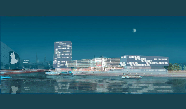 An der Einmündung des Magdeburger Hafens überspielt ein Ensemble skulpturaler Baukörper unterschiedlicher Höhe und Proportion die terrassierte Topografie des Wartgeschosses. In ihrer Ausformung und Situierung erinnern diese Baukörper an Objekte, die von Wasser, Wind und Zeit geprägt sind – amphibische Elemente – Relikte einer Moränenlandschaft.