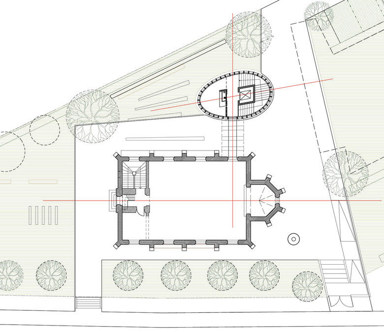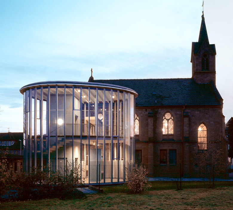 Anlaß für das Gebäude war die Notwendigkeit, einen neuen Zugang mit Foyer zum im ersten Obergeschoß gelegenen Kirchenraum zu schaffen. Ein Aufzug sollte zudem einen behindertengerechten Zugang zur Kirche ermöglichen und im Erdgeschoss wurde eine neue Sakristei untergebracht.