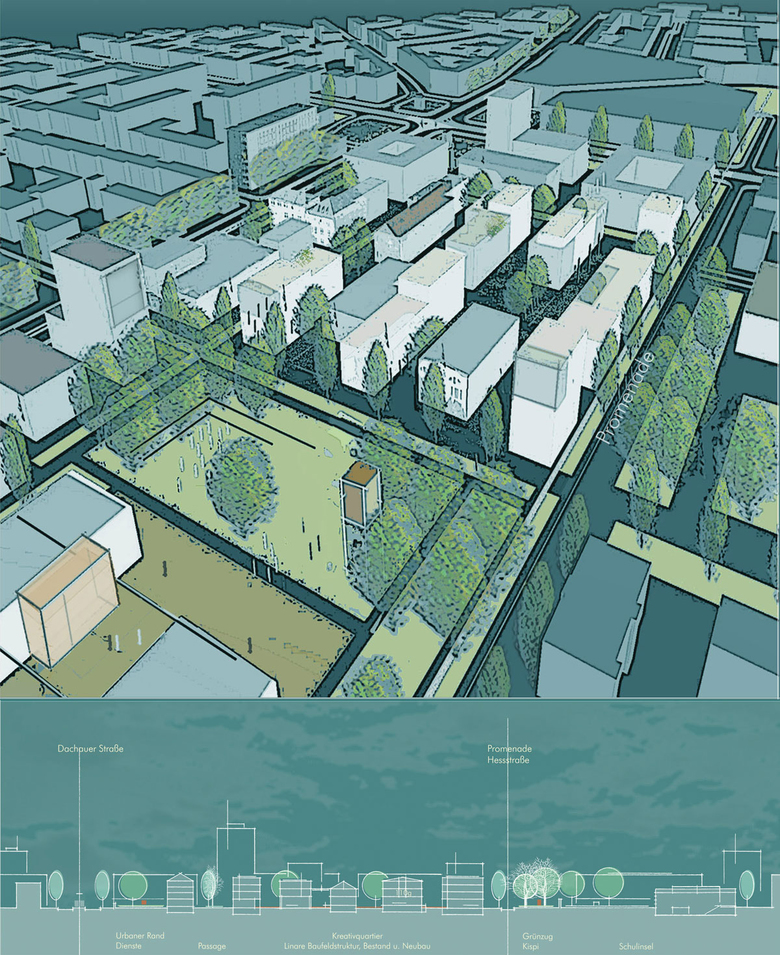Für das ursprünglich militärisch genutzte Areal soll ein Neuordnungskonzept für ein „Kreativquartier“ aufgezeigt werden, in dem sich bereits bestehende Ankernutzungen des Hochschul- und Medienbereichs mit urbanen Funktionen wie Wohnen, Arbeiten, Bildung, Forschung und einer spezifischen Kulturlandschaft räumlich und atmosphärisch überlagern.