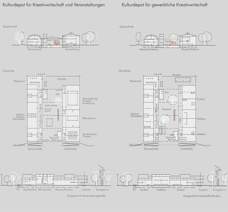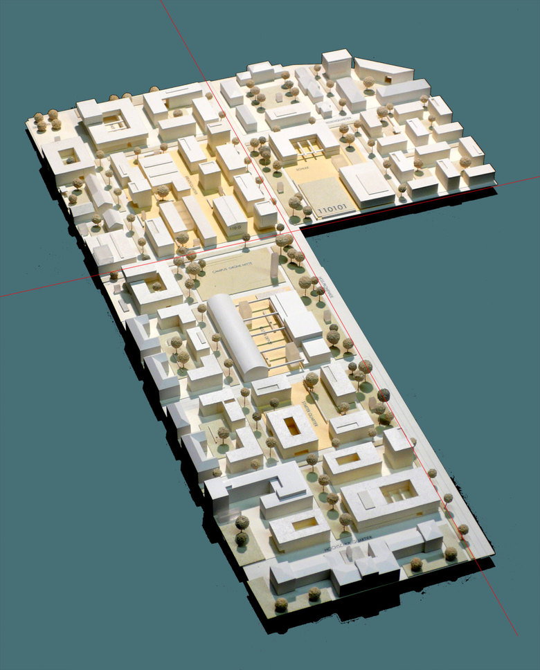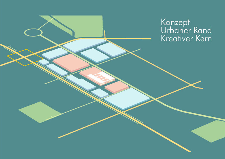 Das strukturelle Leitbild für eine städtebaulich nachhaltige und identitätsgebende Entwicklung wird von der Übernahme der orthogonalen Raumordnung als Grundgerüst für unterschiedliche Quartiere und Nachbarschaften bestimmt. Aus den räumlichen Vorgaben lässt sich eine lineare Baufeld- und Baustruktur mit Weiterverwendung und Ergänzung leistungsfähiger Bauten und Funktionen ableiten. Neben den beiden bestehenden großen Hallen, die für kulturelle und kreativwirtschaftliche Aufgaben vorgesehen sind, wird die partiell zu erhaltende und in Teilen neu zu nutzende Bausubstanz durch modulare, hybride Bausteine ergänzt, die sowohl für aktuelle wie auch noch nicht vorhersehbare funktionale Anforderungen offen sind.