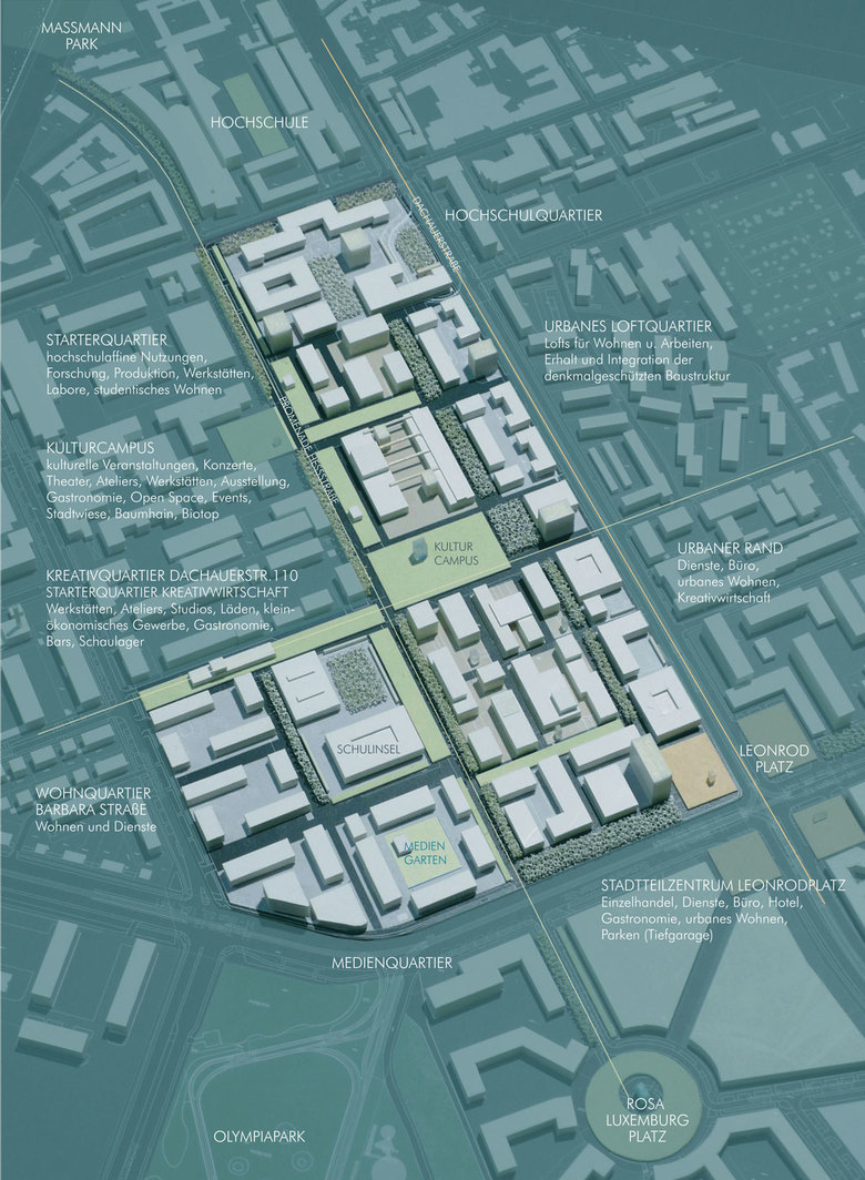 Funktionales Leitkonzept ist eine „urbane-kreative Gemengelage“, bei der die Binnenquartiere als „Kreativer Kern“ durch kulturwirtschaftliche Funktionen und Milieus bestimmt, während entlang der Dachauer Straße als übergeordnete Magistrale der Münchener Kernstadt mit leistungsfähigen, zum Teil denkmalgeschützten und neu geordneten Bereichen ein effizienter städtebaulicher Rahmen als „Urbaner Rand“ entsteht.