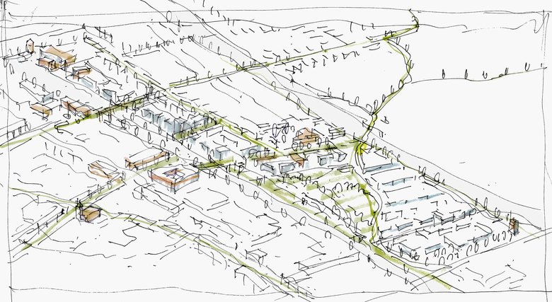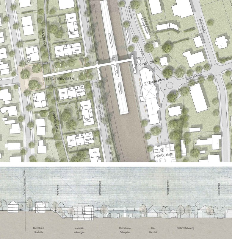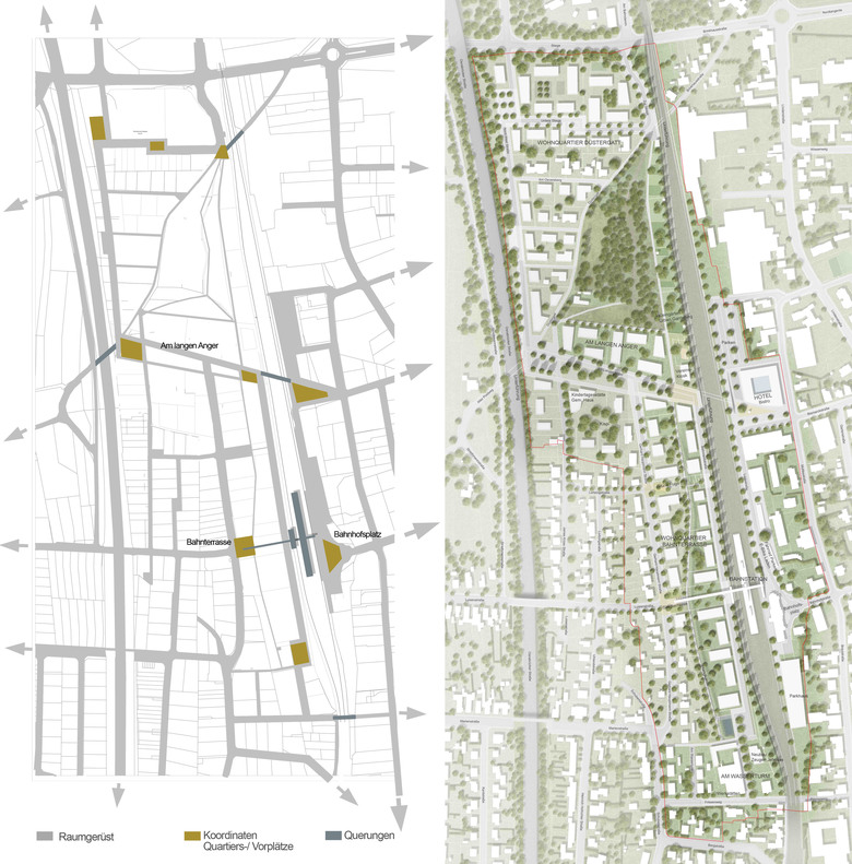 Das Entwurfskonzept wird von vorhandenen Feld- und Flurvorgaben sowie topografischen Merkmalen des Planungsgebiets bestimmt. Es übersetzt diese Gegebenheiten in eine spezifische Raum-, Bebauungs- und Vegetationsstruktur, mit der auch die angrenzenden bestehenden Baugebiete arrondiert werden. Mit einem vernetzenden Raumgefüge und Wegebeziehung löst sich das neu geordnete Quartier aus seiner von Verkehrstrassen der Bahn und Bundesstraße gefassten Isolierung und stellt darüber hinaus mit von der Kernstadt ausgehenden Ost-West-Verbindungen Raumbezüge zu den westlich gelegenen Stadt- und Landschaftsgebieten her.
