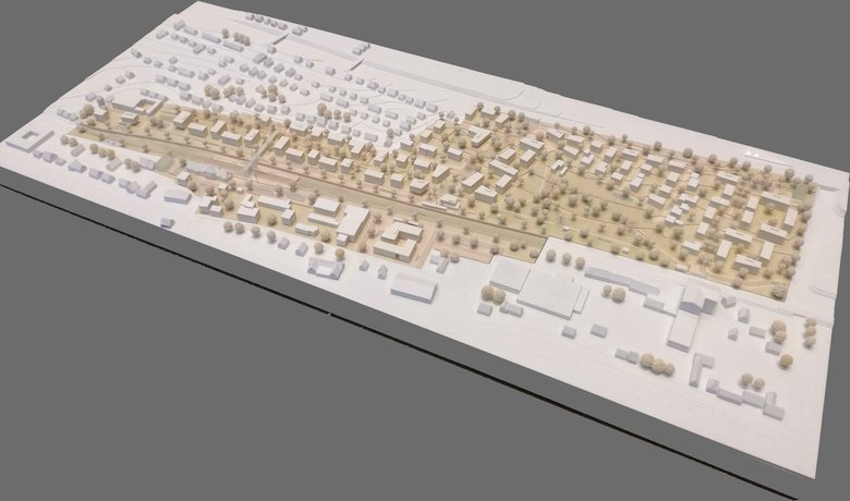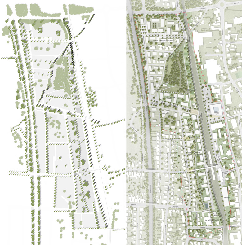 Entlang der Bahn entsteht ein lärmabschirmendes, von „Grünen Fugen“ gegliedertes Baugebiet mit markanter, durchlaufender und von üppiger Vegetation besetzter Hangkante. Im Norden vervollständigt ein auf das geschützte Biotop Düstergatt ausgerichtetes Wohngebiet den westlichen Siedlungsbereich. Mitte und Bindeglied der bestehenden und neuen Nachbarschaften ist der diagonal verlaufende „Lange Anger“, dessen beidseitige Randbebauung Gemeinschafts- und Wohnfolgeeinrichtungen aufnimmt.