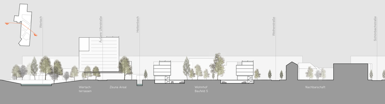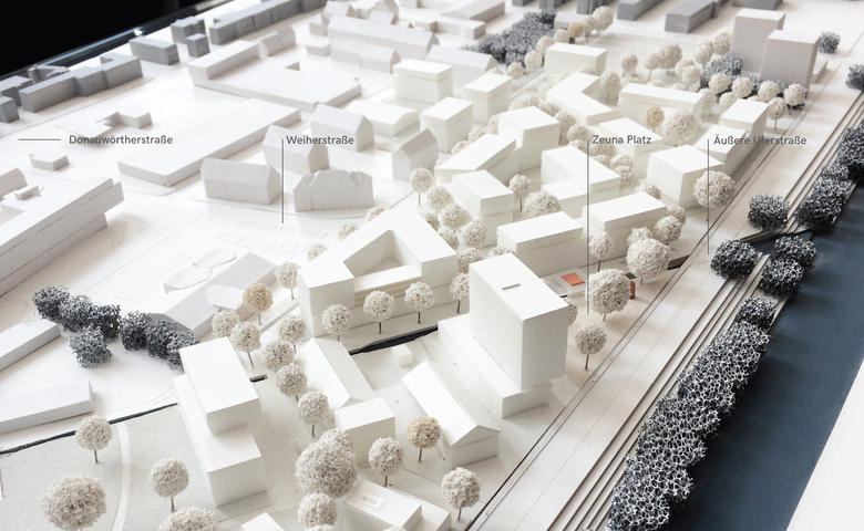 Mit Bezug auf den diagonal verlaufenden Hettenbach und auf ihn ausgerichteten Industrieanlagen vermittelt die Raumstruktur des Zeuna-Quartiers eine spezifische, von der Geschichte des Ortes geprägte Identität. Im Westen wird die benachbarte, fächerförmige Großform eines Versicherungskomplexes zum kulissenartigen Rückhalt des neuen Quartiers. Urbaner Mittelpunkt ist der dreieckige, auf die Wertach ausgerichtete Zeuna Platz, der durch einen auf den Uferbereich schauenden 12-geschossig hohen Baukörper akzentuiert und in der Fernwirkung verankert wird.