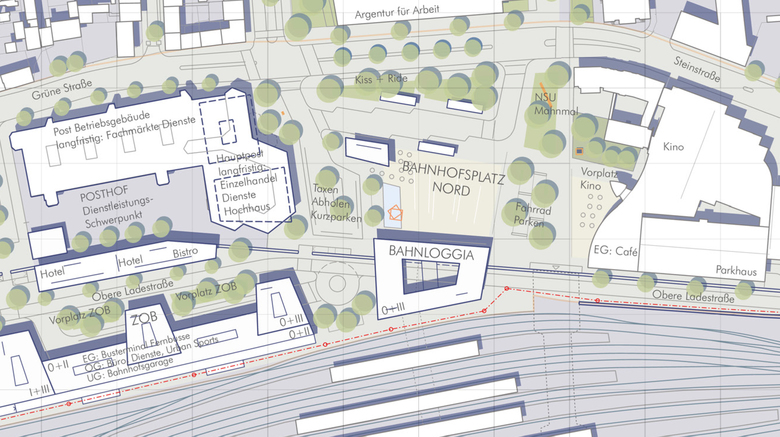 Anstelle des Kopfbaus der Post kann langfristig ein auf den Bahnhofsplatz ausgerichtetes Hochhaus entstehen, das den zentralen Stadtraum in der Vertikalen verankert und mit bestehenden Hochpunkten der Innenstadt korespondiert.