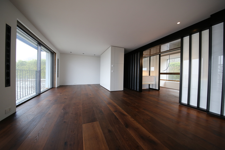 Im Obergeschoss wird die Struktur vollständig ausgebaut und zu einem offenen Privatbereich ausgebaut. Die Eingriffe nehmen die architektonischen Gestaltungsmassnahmen im Eingangsbereich auf und bilden eine lesbaren Kontrast zum Bestand. Die Raumbezüge sind über den Nasszellenkern gesetzt und die Infrastrukturen darin konzentriert. Einige weitere Eingriffe im Gebäude dienen der Klärung von bestehenden Situationen oder werten die