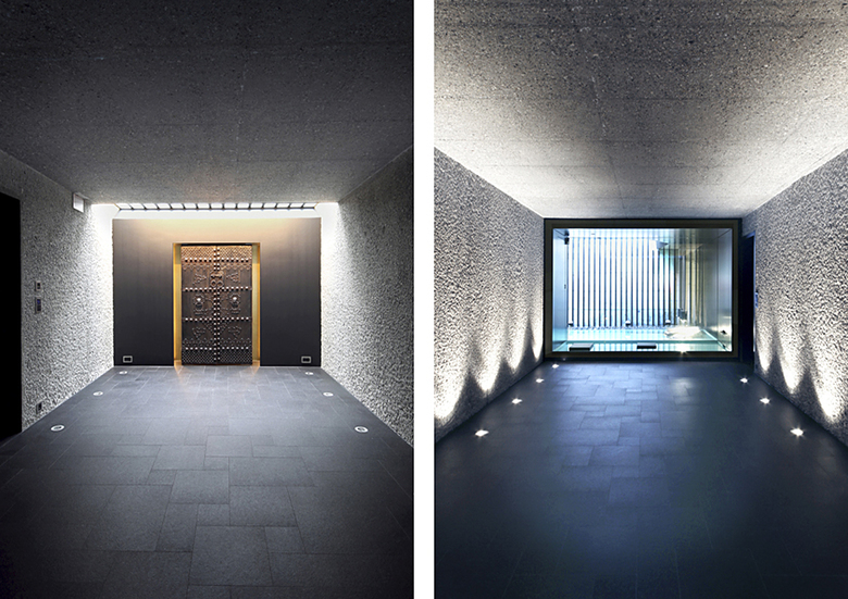 Zuhause finden. Auf der Innenseite verbindet ein zweiter Teich für Koi-Fische den ehemaligen Kellerraum mit dem Aussenbereich. Die gestockten Betonoberflächen und der Einbau von diversen Kunstgegenständen werten den Raum zu einem meditativen Ort im Gebäude auf.