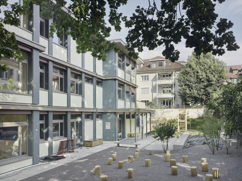 Das ganze Grundstück ist mit Ausnahme der Parkierung Raum für die Kinder und bietet Bewegungs-, Rückzugs- sowie Naturerlebnisräume. Das Haus kann von den Kindern umgangen werden. Der Umgang führt an verschiedenen Räumen unterschiedlicher Intimitäten und Naturerlebnissen vorbei. In verschiedenen räumlichen Kammern können sich verschiedene Gruppen von Kindern aufhalten und konzentriert arbeiten oder spielen. Die Anlage wirkt partiell ordentlich wie die Rasen- und Hartflächen und in Bereichen auch wild und unkontrolliert. Die wild wirkenden Orte sind alle bestockt und abwechselnd mit ruderalen Kies- oder grünen Wiesenflächen bedeckt. Sie weisen eine niedere Schwelle der Aneignung auf und können durch die Kinder einfach verändert werden. Sie sind oft auch Rückzugsräume. Die Bepflanzung nimmt das Gartenhafte aus dem Quartier auf und enthält klassische Gartengehölze wie Sargentskirsche, Flieder, Zimtrosen und Johannisbeeren. Es werden aber auch einheimische Gehölze wie Tierlibaum, Heckenkirsche, Schwarzer Holunder und Rosen gepflanzt. Die verschiedenen Themen werden gezielt gemischt und dadurch thematische Überraschungen erzeugt.