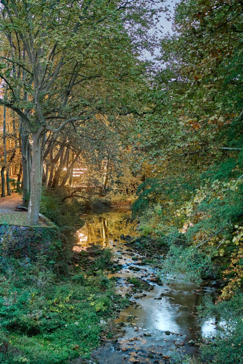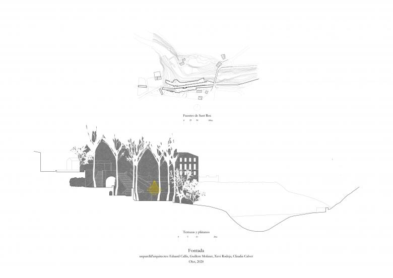 Tres terrazas de piedra volcánica y sendas filas de plátanos, configuran el mejor espacio público de Olot: las fuentes de Sant Roc. Es un lugar húmedo, sombrío y fresco, acompañado por el río y el rumor del agua. Resuelve felizmente el encuentro de la trama urbana con el entorno natural y, paradójicamente, se trata de una infraestructura que responde a la captación de agua, puentes y ferrocarril.