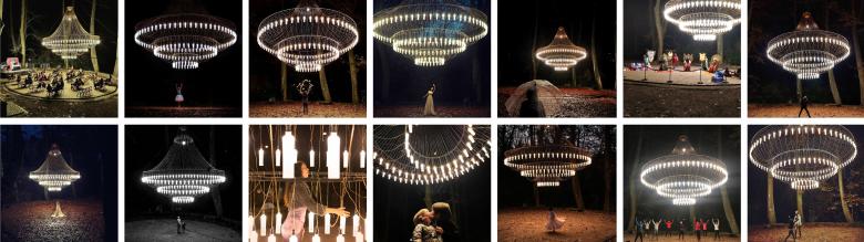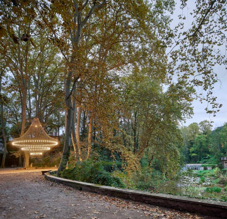 Ciento cincuenta bombillas y sus cables eléctricos dibujan una lámpara de salón, de 8m de altura y 8m de diámetro, estructurada en tres anillos. Se suspende a 3,5m del suelo, coronando un ensanchamiento semicircular definido por la fuente principal y una fila de esbeltos árboles. Todos los componentes son reutilizables y los difusores -conos de hilo para maquinaria textil- son reciclados.