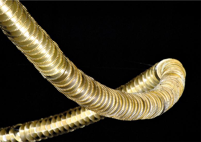 La iluminación proviene de tiras continuas leds cedidas para la ocasión y a partir de las cuales se formaliza la propuesta. El difusor se forma con bandejas de pastelería molduradas con una cara dorada y la otra blanca, alternadas con vasos de papel translúcidos. Este, suaviza la brillantez de los leds y aporta calidez a la temperatura de color. Las diferentes calidades de las dos caras de la bandeja dan vibración a la nube, que sumado a la traza curvilínea, ofrece un aspecto cambiante según el punto de vista.