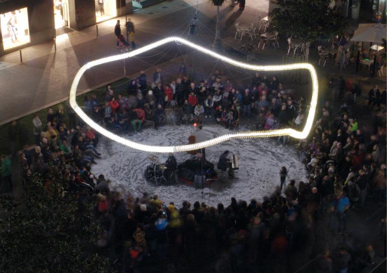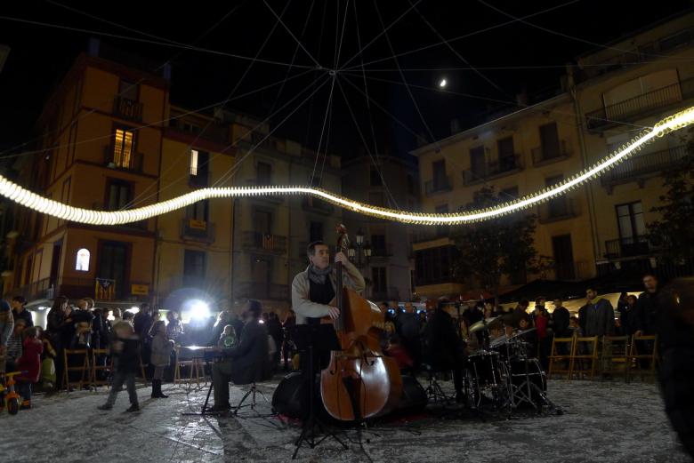 Acomodar, acompañar, techar un concierto de jazz en la Plaza Mayor de Olot. Construir una atmósfera para una noche fría con los matices y reflejos de una nube dorada. Suspender un radiador luminoso de 35 metros de longitud, a baja altura, construido con cartón alternando vasos de café y bandejas de pastelería. Señalar el centro de la plaza y de la ciudad, con la reverberación del público y una alfombra reflectante de confeti. Domesticar el espacio público con pocos recursos.