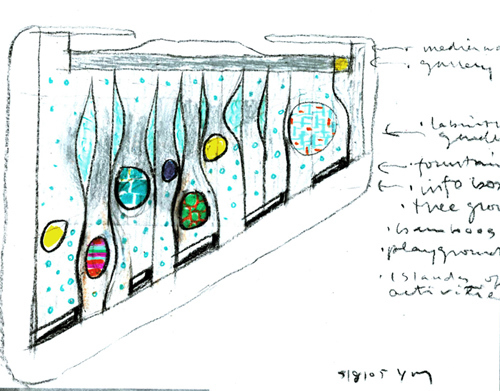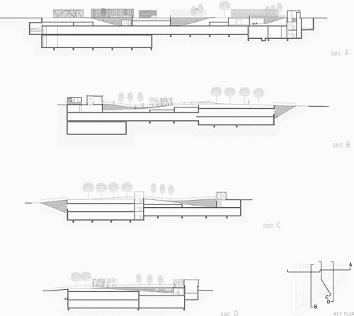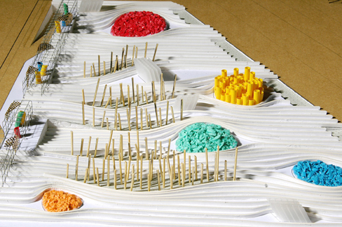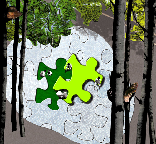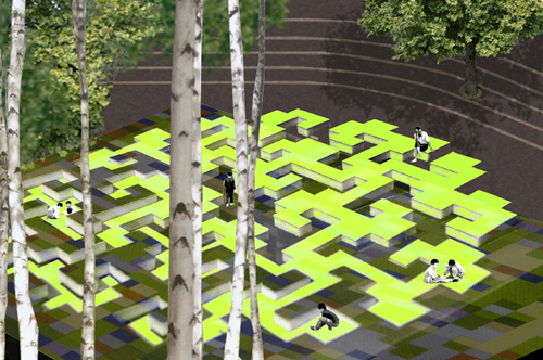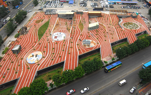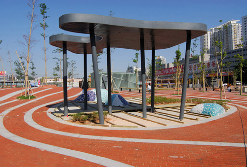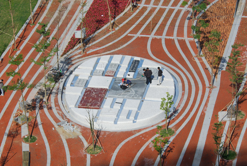 Inspired by the natural texture of the earth, the whole surface of the site is covered with one coherent skin of undulating strips, which resembles the water tides flowing up and down. While shedding the existing underground parking lot, this skin of free form also helps to connect two adjacent lots interrupted by traffic. The linear paving pattern also suggests a strong sense of dynamic urban activities. Along with the flow of the strips, oasis of flower islands are randomly arranged to create pleasant and intimate urban enclaves against the chaotic surrounding urban environment.