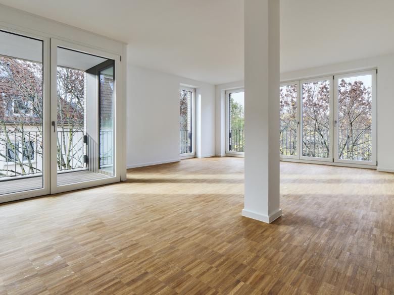 Die Erschließung der Obergeschosse erfolgt über ein lichtes, zum Hof hin orientiertes Treppenhaus. Ergänzend zu den Räumlichkeiten der Gemeinde beherbert das Haus Büroräume der Caritas, sechs Seniorenwohnungen, zwei Familienwohnungen sowie drei großzügige Dachgeschosswohungen. Der ruhende Verkehr wird in einer Tiefgarage untergebracht. Nachhaltige Materialien wie Klinker und Holz, ergänzt durch großzügige Verglasungen, prägen die offene und freundliche Gestalt des Gebäudes.